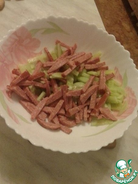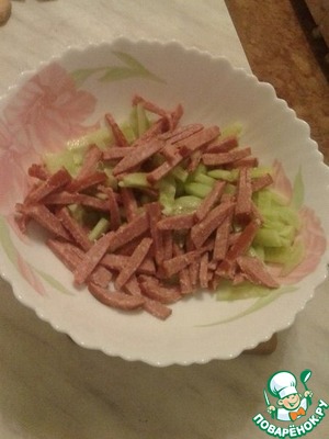 Колбасу режем соломкой, кладем в салатницу