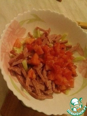 Помидор режем кубиками, кладем в салатницу