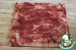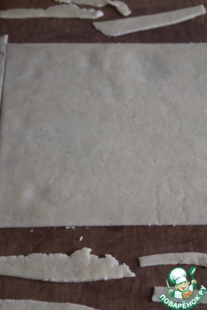 Сделать для удобства шаблон из бумаги - квадрат со стороной 18 см. Раскатывать тесто через пленку или бумагу для выпечки, вырезать шаблоном квадрат, обрезки не выбрасывать! Поставить в разогретую до 200 духовку и выпекать 8-10 минут - ориентируйтесь на свою духовку, не передержите!
