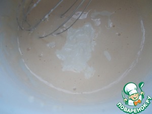 Дабавляем сразу к яичной массе сметану, затем муку с разрыхлителем.