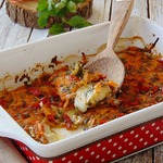 Сверху кладем приготовленную смесь и ставим в предварительно нагретую до 205С (400F) духовку на 25 минут.