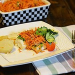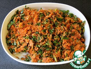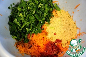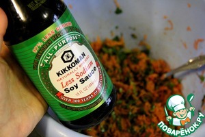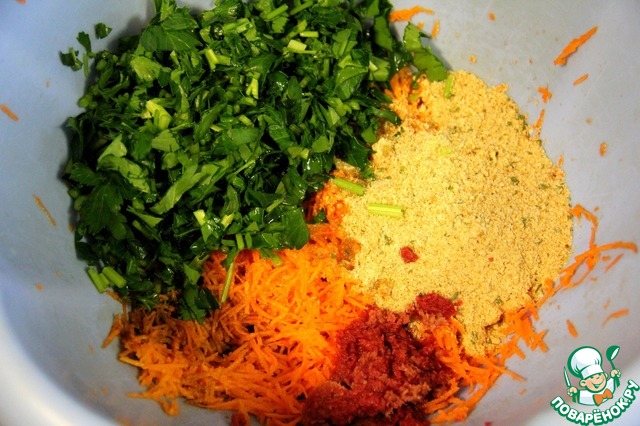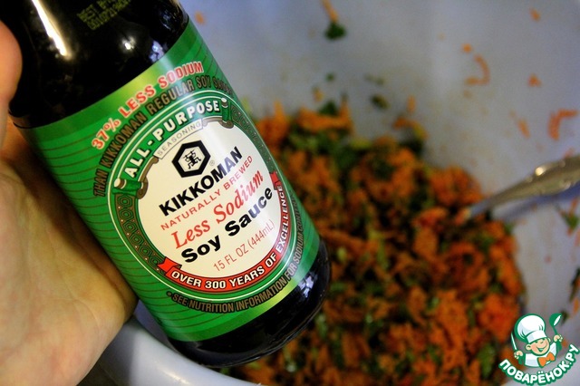 Смешиваем морковь, петрушку, соевый соус, лимонный сок, хлебную крошку и хрен.