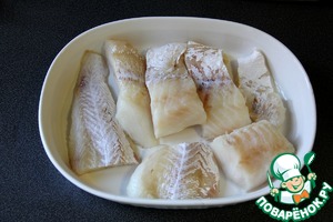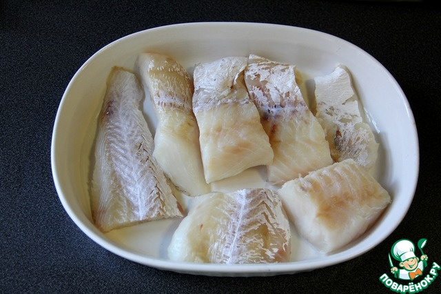 Рыбу моем, режем на порционные куски и выкладываем в огнеупорную форму.