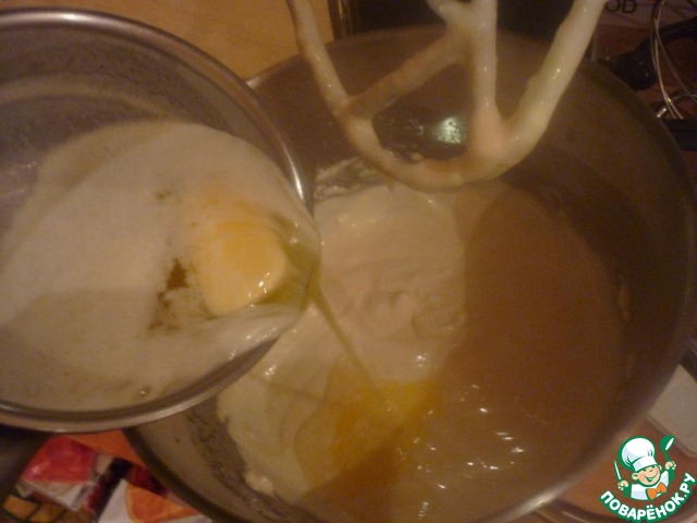 К полученному тесту добавить 1/2 муки с разрыхлителем, молоко и далее остальную муку.