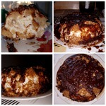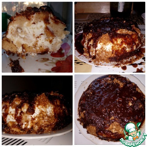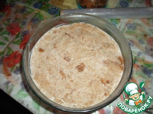 Кусочки коржа смешать со сметаной порциями и плотно уложить в подходящую по форме посуду. У меня это стеклянная миска полусферической формы. Утрамбовать хорошенько-чтобы не было пустот. Затянуть пищевой пленкой. Поместить в холодильник на верхнюю полку минут на 30-40 (можно и на час).