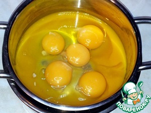 Сливки вскипятила с семенами ванили и, помешивая, влила тонкой струйкой в яичную смесь.