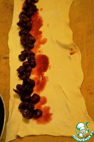 Берем одну часть слоеного теста, раскатываем в пласт и делим на 2 равные полоски, поступаем также со второй частью.