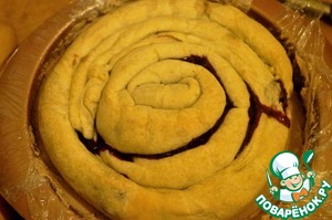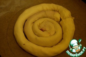 Из двух частей теста сворачиваем улитку, выкладываем на противень застеленный бумагой для выпечки, улитка должна поместиться в начерченную окружность.