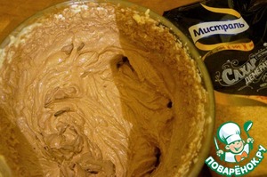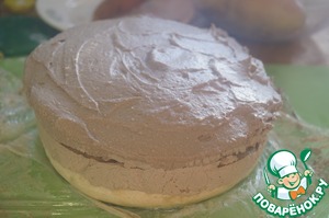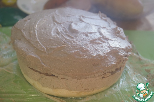 На второй корж выложить весь крем №2, хорошо разровнять и убрать торт в холодильник на всю ночь.