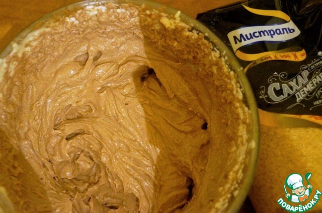 сливки взбить до устойчивых пик, но не перебить, а то получится масло. Добавить аккуратно творог и какао-порошок, взбить.