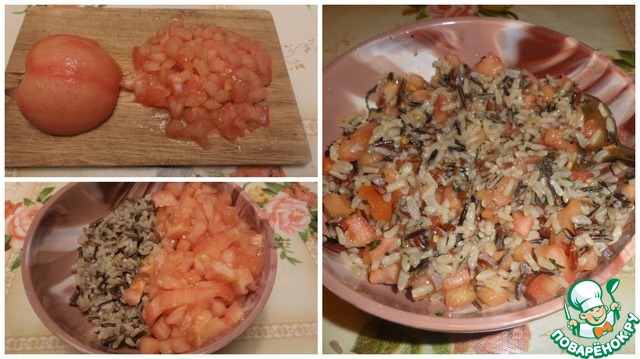 В чашку выкладываем сваренный рис и нарезанный помидор.