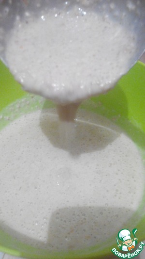 По истечении указанного времени добавляем яйца, соду, соль, сахар, раст. масло, все перемешиваем и получаем тесто, немного жиже, чем на оладьи.
