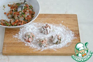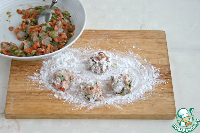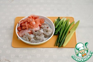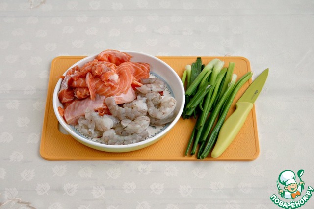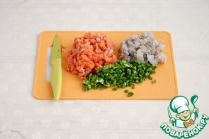 Мелко порезать креветки, рыбу. зеленый лук