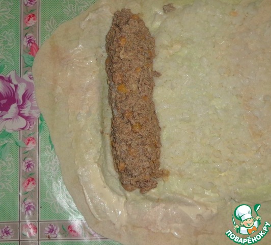 На край лаваша по верх рисовых хлопьев выложить мясную начинку в виде колбаски.