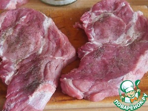 Мясо нарезать на куски, немного отбить, посолить и поперчить. Лучше всего для этого рецепта подойдет ошеек.