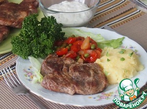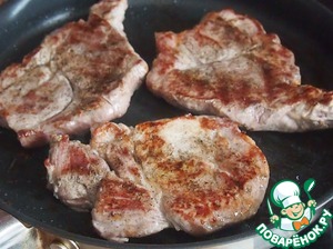 На сковороде (у меня сковорода-гриль) растопить ложку свиного жира (или растительного масла) и обжаривать мясо с обеих сторон сначала на сильном огне, затем огонь уменьшить. Мясо несколько раз перевернуть. Готовность мяса проверить с помощью зубочистки - проколоть зубочисткой самое толстое место в куске, если из прокола выступает прозрачный сок, значит, мясо готово. Вся опперация занимает минут 15, не пересушите мясо.