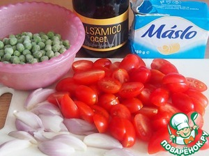Высыпать в сковороду помидоры, лук и горошек, немного обжарить. Добавить ложку бальзамика и щепотку соли. Еще пожарить пару минут. Все это делается быстро, помидоры не должны развариться и потерять форму.