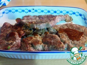 Если вы готовите на большую компанию заранее, то сложите мясо в форму для запекания, вылейте из мисочки сок, который слили из сковородки.