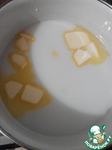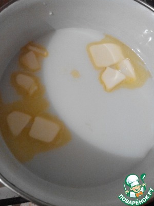 Подогреваем немного молоко, воду и масло (масло само там расплавится).
