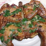 Готовим не хитрую заправку для цыплёнка, для это мелко рубим (я сегодня немного поленился) два зубчика чеснока, небольшой пучочек кинзы, добавляем соль 1 ч. ложку и заливаем 100 гр. не крутого кипятка. Отставляем.