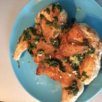 Выкладываем на предварительно разогретую сковороду топлёное масло, затем цыплёнка и ставим на него гнёт, я использовал 3 л. кастрюлю (с водой). Жарить надо на достаточно сильном огне, но не на полном. Сначала обжариваем цыпленка со стороны кожи, а потом с "открытой" костной. Понадобится всего один переворот, получается ~ по 10 минут с каждой стороны.