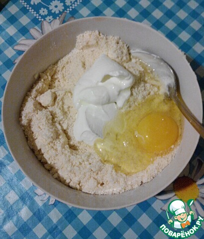 Добавить сметану, яйцо и гашеную соду. Вымесить тесто.