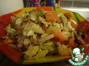 Для этого нашинкуем пекинскую капусту, помидор и огурец порежем, добавляем мелко нарезанную зелень и 1 ст. л. оливкового масла.