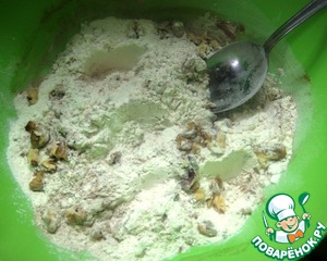 В миске соединить муку, орехи, соль, корицу, мускатный орех, ванильный сахар и разрыхлитель теста.