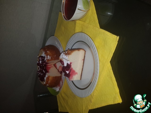 Целиком не удалось сфотографировать... очень вкусно и нежно, немного опустилась при остывании... но очень воздушная и нежная- это не поспоришь... сверху залила вишневым желе..