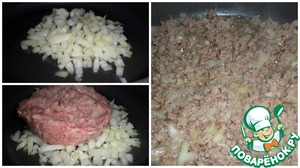 На сковороду наливаем растительное масло, выкладываем лук и мясной фарш. Обжариваем до готовности.