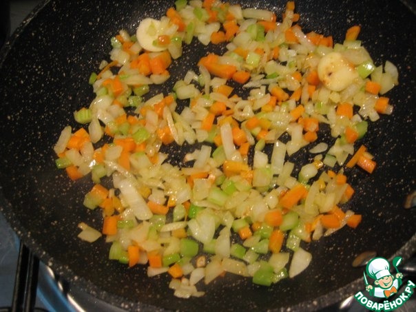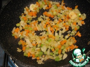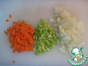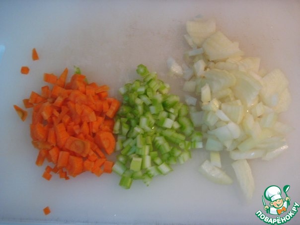 Лук, морковь, стебель сельдерея порезать кубиками.
