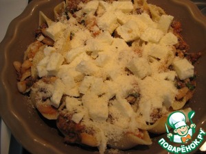 Положить ракушки в жаропрочную форму, посыпать моцареллой и пармезаном.
