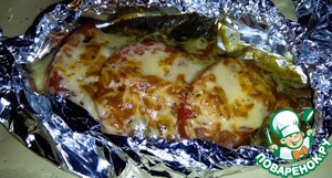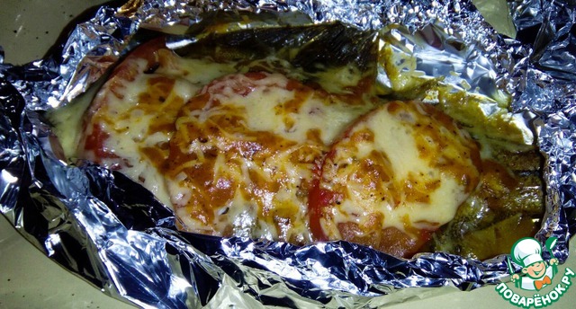 Ставим греться духовку до 180 градусов. Т. к. рыбины у меня было 4, я подготовила 4 одинаковых пласта фольги. Фольгу брызгаем раст. маслом. Сверху укладываем рыбу, поверх нее помидоры и посыпаем сыром.