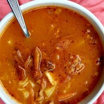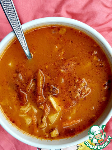 Положить рис поджаренный лук, грибы, томат, аджику, хмели-сунели, давленный чеснок, посолить и поперчить.