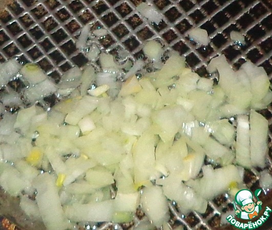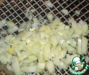 На оливковом масле обжарить мелко порезанный репчатый лук (2-3 минуты).