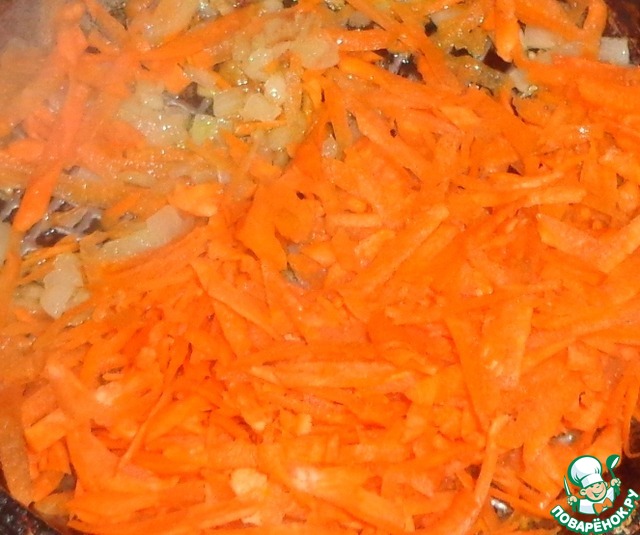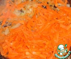 Тертую морковь добавить к луку в сковороду и прожарить еще 3 минуты.