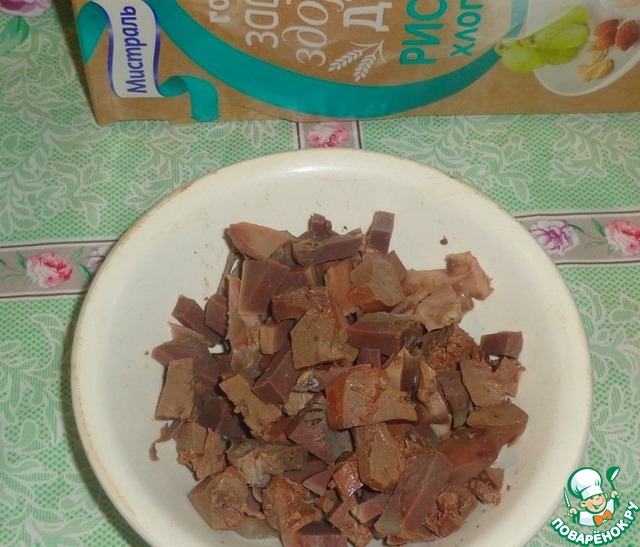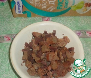 Отварную гусиную печень и куриные желудки порезать кубиками.