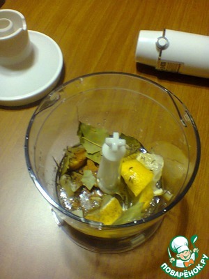 В чашу блендера складываем ингредиенты для маринада: растительное масло, мед, лавровый лист, лимон с цедрой, 2 зубчика чеснока, тмин, зелень (у меня укроп), соль, черный и красный молотый перец.