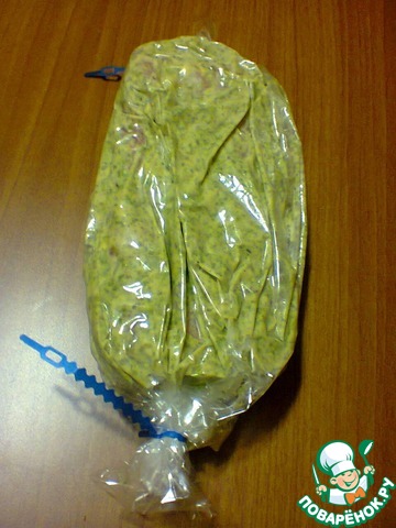 Залить мясо маринадом, поставить в холодильник на 2 часа. Через два часа помещаем мясо в духовку, разогретую до 180 градусов, и запекаем примерно полтора часа. Затем разрезаем рукав и даем подрумяниться минут 10-15.