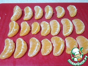 Сверху выкладываем чуть меньше половины мандарин и заливаем еще одним шаром теста.