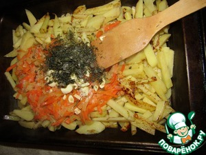 Морковь, лук, картофель пререложить в функциональную емкость, добавить соль, зелень (укроп, петрушку, кнзу), специи (паприка, смесь перцев, чеснок). Если готовлю только для взрослых, то добавляю еще аджику и немного майонеза. Все перемешиваем и оставляем пропитываться.