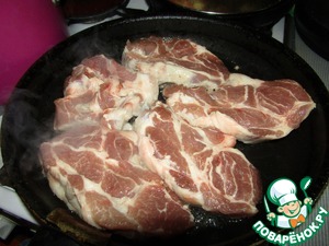 Мясо промакнуть бумажной салфеткой и обжариваем на сковороде, на сильном огне до образования корочки (масло как можно меньше). После того, как свинина подрумянилась посыпаем ее солью, специями ( у меня уцхо-сунели, хмели-сунели и мускатный орех) -