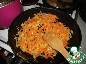 Лук нашинковать мелким кубиком, морковь -соломкой и обжарить на раст. масле до золотистого цвета. Переложить в отдельную емкость.