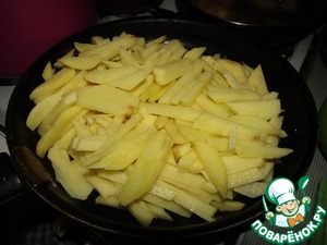 Картофель очистить, нашинковать брусочком 0.5-0.7 мм. и обжарить на сковороде, на сильном огне в небольшом кол-ве раст. масла, до образования корочки (до полуготовности).