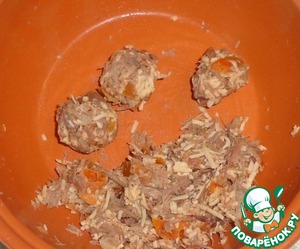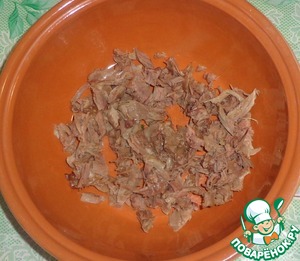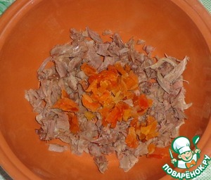 Курагу распарить кипятком и порезать небольшими кусочками.