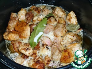 Выкладываем в чашу, заливаем пивом (я беру обычно светлое разливное), добавляем лавровый лист, соль, специи.