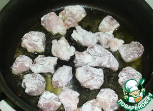 Мясо режем средними кусочками и обжариваем на большом огне.