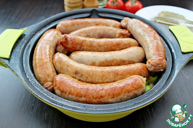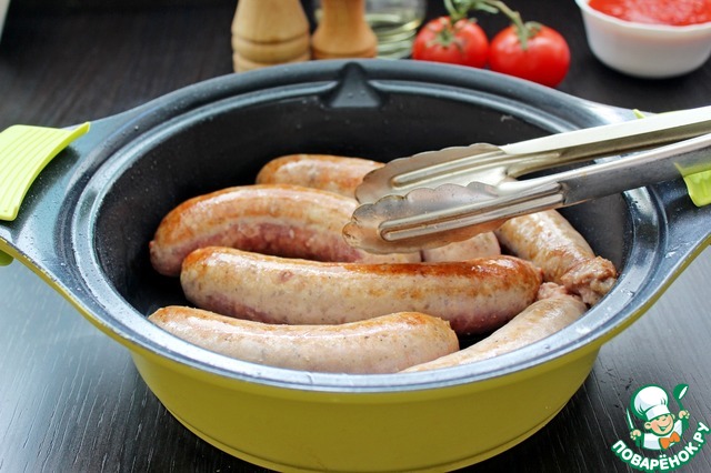 Колбаски обжарить на 1 ст л раст масла до румяности, обжаривать на сильном огне чтобы они в середине оставались сырыми а только прожарились снаружи.