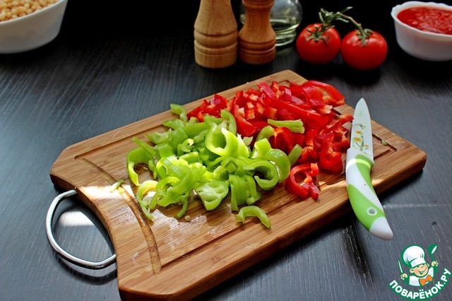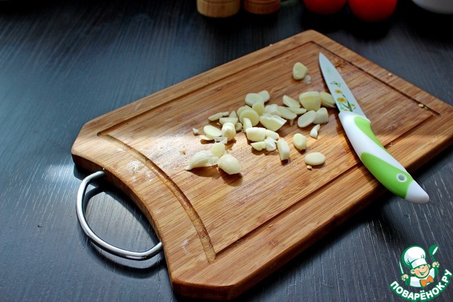 К слегка обжаренному луку добавляем чеснок, жарим минуту, добавить перец и жарим еще с пару мин. Не забываем помешивать!!