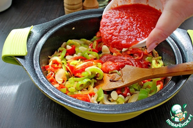 Вливаем консервированное томатное пюре или томаты кусочками, доводим до кипения. Приправим по вкусу.